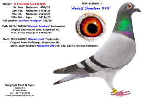 De volgende goede jaarling is ‘Asduif Saarloos’. Deze blauwe doffer won o.a. de 28e Nationaal Narbonne. Deze jonge topper komt uit ‘De Blauwen Saarloos’ (Saarloos en zn, Klaaswaal), die ook de vader is van duiven die de 2e Nationaal Perpignan, de 27e nationaal Valence en de 89e Nationaal Perpignan wonnen. Moeder is ‘Blauwe Louis’ van Team Vollebregt. Zij is ook de moeder van de 89e nationaal Perpignan en de 18e Nationaal Narbonne. Zij komt uit ‘Inteelt Witneus’ met ‘Noëla’ (Peiren x Freialdenhoven).