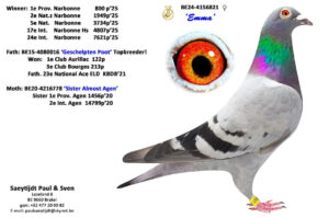 Afgelopen seizoen hadden Paul en Sven nog twee toppers van het ‘bouwjaar’ 2024. ‘Emma’ won de 5e Nationaal Narbonne tegen 3.734 duiven (24e Internationaal tegen 7.621 duiven). De vader van deze goede jaarling won zelf de 23e Aurillac tegen 1.437 duiven. Hij komt uit een zoon van het topkoppel Asgrauwen Libourne met de Pau-duivin. De oma van vaderskant is de moeder van de 23e Nationaal Narbonne. Zij komt uit ‘De Gekwetsten’ van Collet-Dubois met ‘De Blauwe Haelters’ van Yvan Haelters. De moeder is een zus van ‘Almost Agen’, die de 2e Nationaal Agen won. Deze zus is de moeder van de 1e Nationaal Narbonne tegen 3.734 duiven. Zij komt uit een zeer goed kweekkoppel Zoon Bordeaux-duivin met de ‘Vale Van de Walle’.