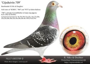 ‘De 478’ van 2022 is een goede duivin. In haar geboortejaar is opgeleid op de ‘taartvluchten’, die in het najaar worden gehouden. Als jaarling won ze al de 232e NPO Bergerac tegen 2.568 duiven. In 2024 won ze prijs op Ruffec, terwijl ze gewond thuis kwam. Later in het seizoen won ze de 58e NPO Bergerac tegen 2.568 duiven. 2025 startte ze met de 336e nationaal Pau tegen 3.503 duiven om daarna de 30e nationaal Dax tegen 2.230 duiven te winnen. De vader van deze goed presterende duivin is een volle broer van ‘Robin’, die o.a. de 1e nationaal Bergerac tegen 25.628 duiven won bij Harold Zwiers. Over deze duiven kunt u meer lezen in het artikel over Robin Bakhuis. De moeder is ‘De Gijsduivin 709’, die terugkomt in deel 3 van de reportage.