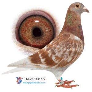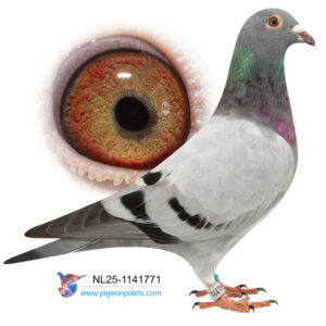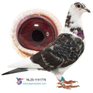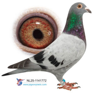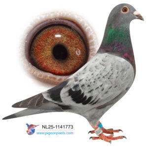Deze doffer is speciaal gekweekt uit een doffer van Pieter Guelen en een duivin van Walter van der Meulen, beiden overwegend van het bekende ras van Jan Ernest. Zowel zijn vader als moeder komen uit hele goede kweeklijnen. De doffer van Pieter Geulen komt uit zijn Stamdoffer, waar o.a. de 1e Nationaal Bergerac 2022 uit komt en nog 12 andere Nationale Top 10 duiven. De moeder van Walter van der Meulen komt uit de 823, stamvader van Walter, waar meerdere Nationale Winnaars van Barcelona vanaf stammen.